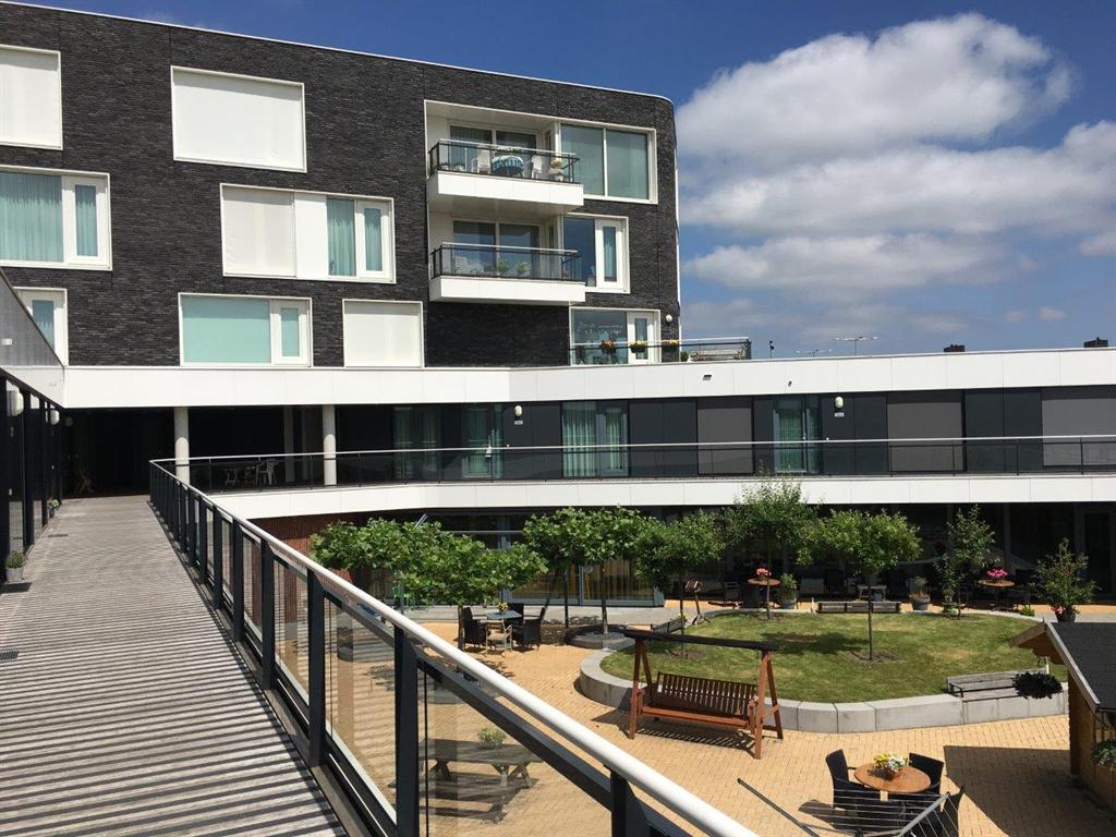 galerijhekken met glasvulling en leuningen. De glashekken creëren een open beeld waardoor de binnentuin wordt betrokken bij het gehele zorgcentrum met appartementen.